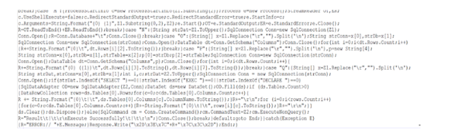 These databases or FTP servers are then accessed either by compromised credentials or by brute force attempts leading to accessing these high-value assets. Figure 1.0 shows the code from china chopper web shell used to connect and perform queries to the SQL server.