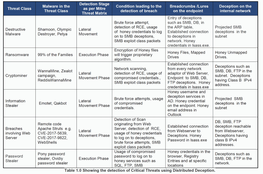 • In many of the cases such as breaches involving web server, detection of information stealer, detection of crypto miners, detection of destructive malware presented in the table above, distributed deception architecture is capable of detecting threat actor or worm after it has breached an organization before the final intent is completed. The algorithm or the techniques leveraging deception which is used to identify the threat is generic, i.e., it is independent of the purpose of the worm or the threat actor.