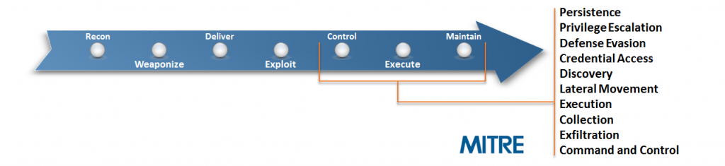 Todaybs breaches are overwhelmingly carried out in a series of sophisticated, multi-stage attacks. The stages of such attacks can best be described by a bCyber Kill Chain,b which as per MITRE ATT&CK Adversary Tactic Model [1] breaks down cyber intrusions into the steps shown in figure 1.0.