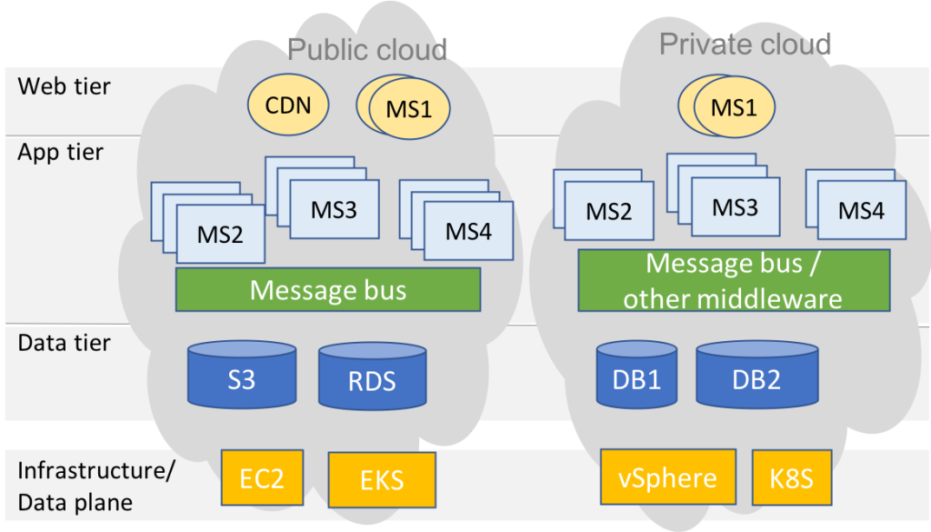 Ideally, the deception should mirror the application. The next generation of applications are designed with scale and agility as their top goals. This requirement means they typically span the hybrid cloud, are based on a microservices design pattern, and leverage as many native cloud services (e.g., AWS S3, Spark/EMR) as your budget would allow. The figure below illustrates a typical application stack. This expanded set of options to build applications increases the attack surface and makes it essential that any security solution cover all these diverse resources at cloud scale. Consequently, the deception objective is to mimic production applications and spin up decoys as a tiered-stack that includes front-end, message bus, database and backend tier services, without conflicting or overlapping with existing production workloads, that will work across the full spectrum of platforms in the hybrid cloud.