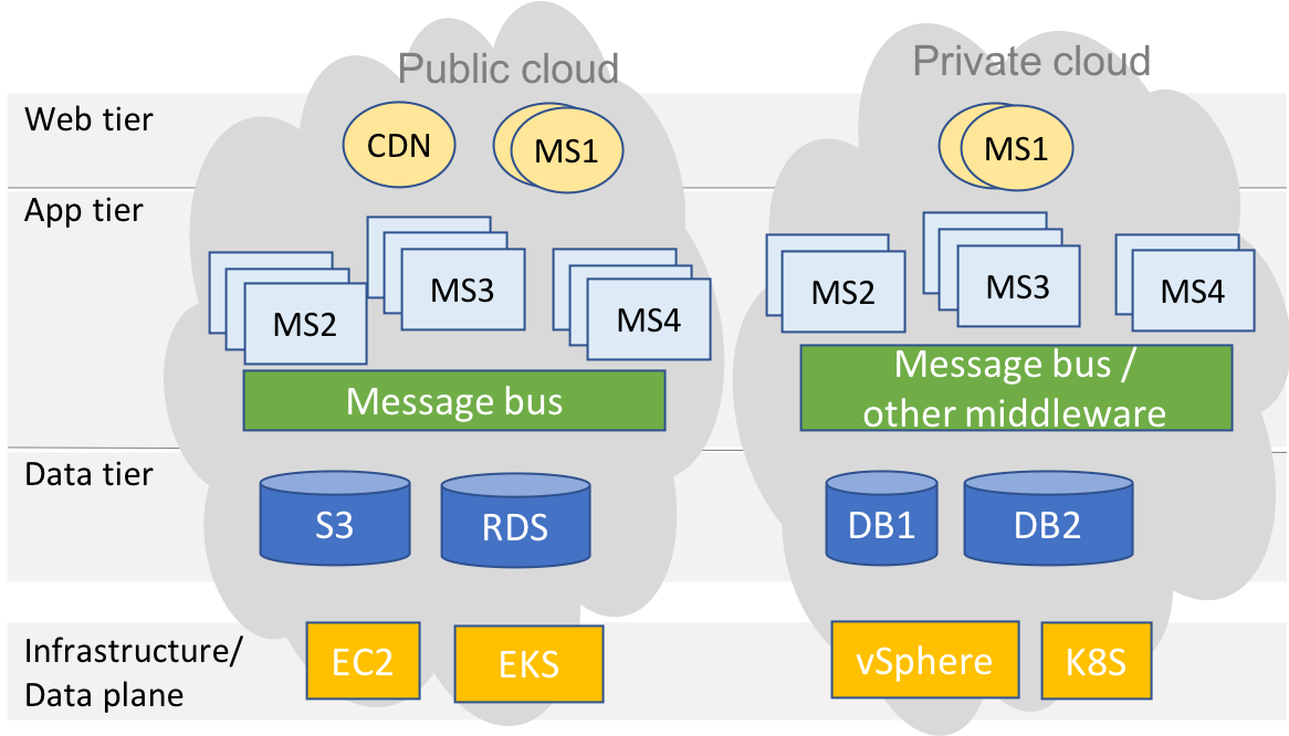 Ideally, the deception should mirror the application. The next generation of applications are designed with scale and agility as their top goals. This requirement means they typically span the hybrid cloud, are based on a microservices design pattern, and leverage as many native cloud services (e.g., AWS S3, Spark/EMR) as your budget would allow. The figure below illustrates a typical application stack. This expanded set of options to build applications increases the attack surface and makes it essential that any security solution cover all these diverse resources at cloud scale. Consequently, the deception objective is to mimic production applications and spin up decoys as a tiered-stack that includes front-end, message bus, database and backend tier services, without conflicting or overlapping with existing production workloads, that will work across the full spectrum of platforms in the hybrid cloud.
